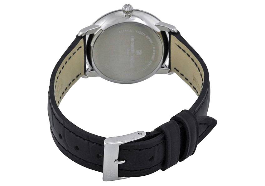 Frederique Constant gümüş renk Kadranlı, siyah deri kayışlı kadın saati FC235M1S6 Sabit üst halkalı, 29 mm çapında gümüş ton paslanmaz çelik kasa. Çizilmeye karşı dayanıklı safir kristal cama sahip.